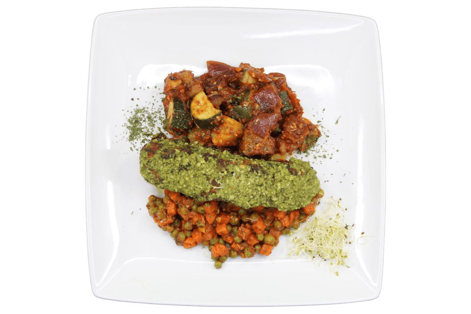 Lean, grilled chicken breast is slicked in our tasty pesto, supercharged with kale, basil, and cashew butter Garlicky super greens sauté of kale, spinach, escarole, tricolor swiss chard, and shredded parmesan A side of cauliflower, roasted with a pinch of cayenne, for a final veggie boost