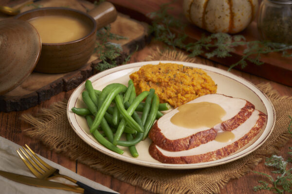 Savor a delightful turkey portioned meal that will tantalize your taste buds. Enjoy tender slices of juicy turkey breast, accompanied by a velvety sweet potato mash, generously smothered with savory gravy. Complete your plate with crisp and vibrant green beans, providing a refreshing and nutritious touch to this delectable feast. Enjoy the flavorful symphony!