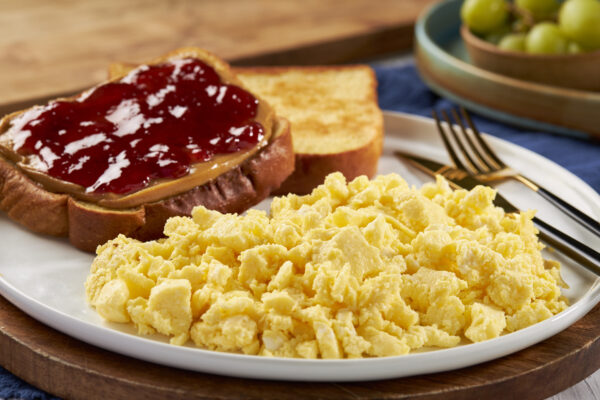 Savor the scrumptiousness of a nutritious sunflower butter and organic strawberry jelly French toast alongside protein-packed scrambled eggs. Sunflower butter is rich in essential minerals. Nutritional values include high protein content for muscle repair, healthy fats for sustained energy, and vitamin E for antioxidant protection. Delight in this wholesome breakfast!