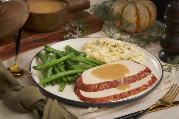 Indulge in a mouthwatering feast featuring succulent slices of juicy turkey breast, perfectly paired with creamy Yukon mashed potatoes and drizzled with rich, savory gravy. Complementing this delectable combination are vibrant green beans, adding a refreshing touch to your perfectly portioned and satisfying meal. Enjoy every flavorful bite!