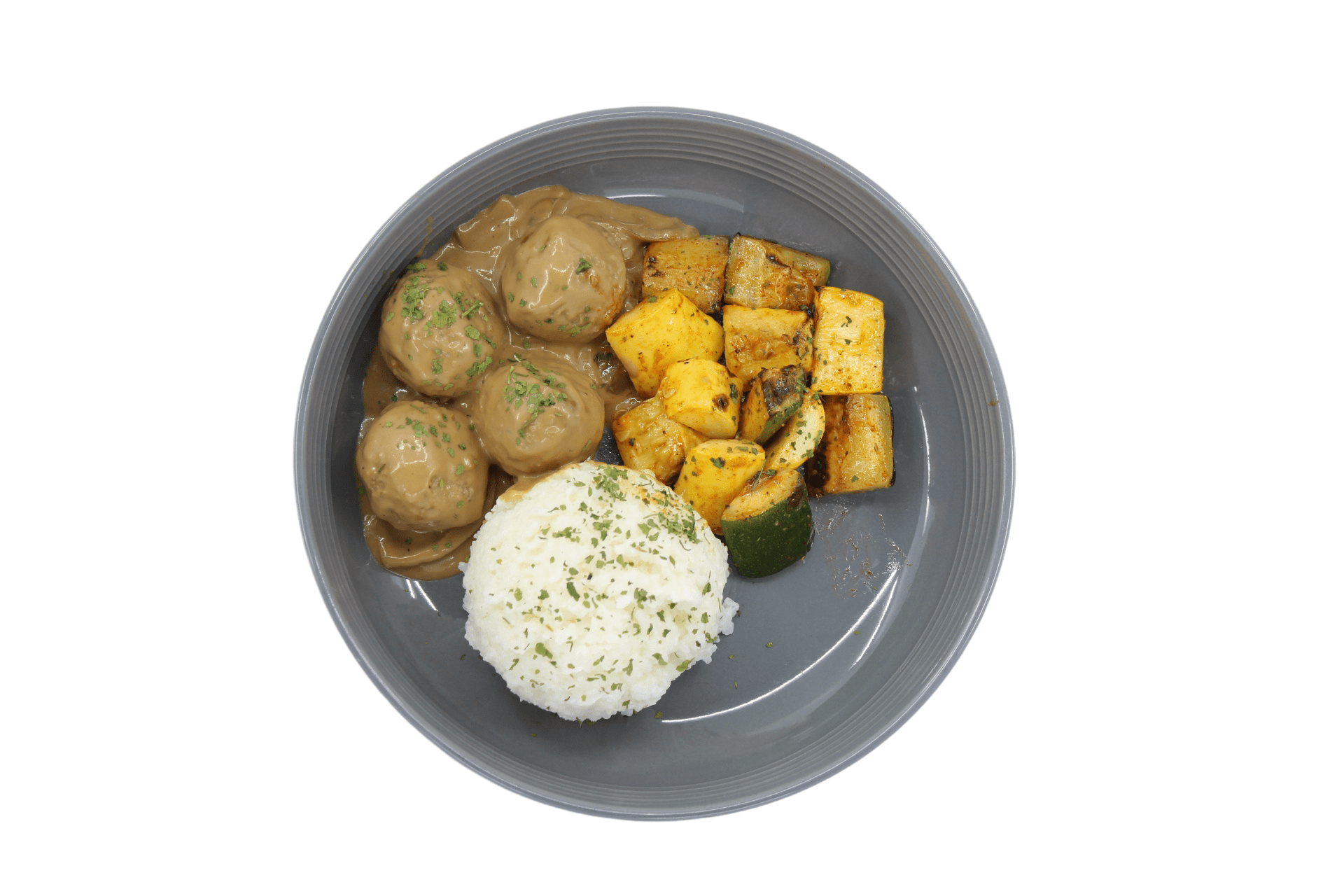 We have added this amazingly delicious and nutritious vegan swedish meatballs meals to our vegan menu because of the simplicity and yet perfect combination of the ingredients involved. We first started with the best swedish meatless ingredients, then seasoned and mixed to create the perfect meatballs. Then we matched this flavorful protein with a great tasting made in house Vegan Swedish meatball Sauce. Lastly we added our very own Coconut Jasmine Rice Risotto with a bit of roasted mixed squash.